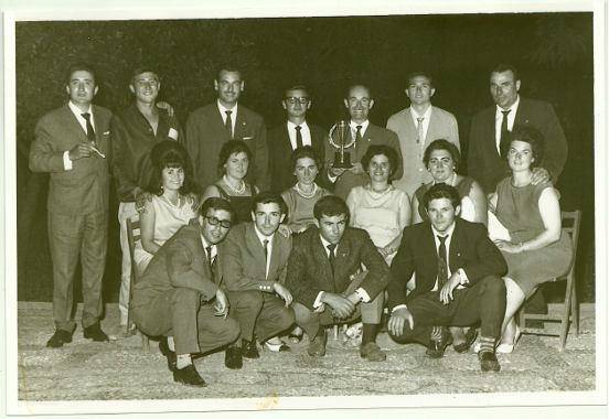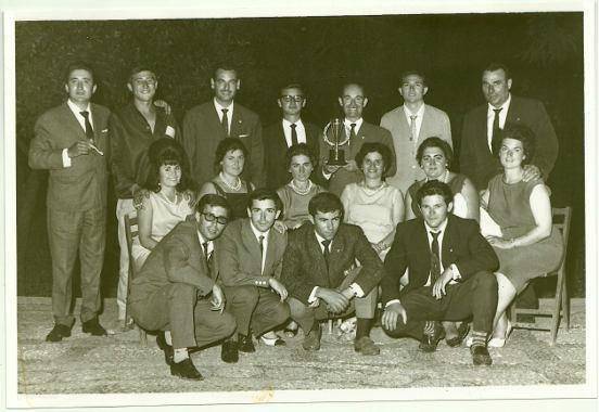 Fotografía de los miembros del Vespa Club Vigo asistentes al Rally de Andalucía tras la cena de Gala efectuada en Sevilla. Cuenta Julián Mouriño, que el premio sostiene, es el que recibió la expedición Viguesa por ser la más numerosa y la que más quilómetros hizo para participar en el Rally. Fotografía tomada el 22-7-1963.