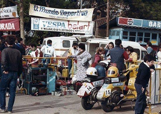 En el año 1984, sin el patrocinio de ningún piloto, escudería o taller, Manolo Vespa se llevó su propio “taller móvil” a las 6 horas de resistencia celebradas en el circuito urbano de Montjuic. A la derecha, podemos ver dos motos de la “Escudería” MOTO TRES de la que ya hemos hablado en otra ocasión (taller dirigido por Luis Pérez Lafuente, Juan Ares y Cardama). Parea este desplazamiento, la expedición de pilotos gallegos, mecánicos y acompañantes alquilaron un autobús. En el espacio destinado a los equipajes, también metieron las ocho vespas que iban a competir. Para que les entrasen todas, tuvieron que desmontarles las ruedas.