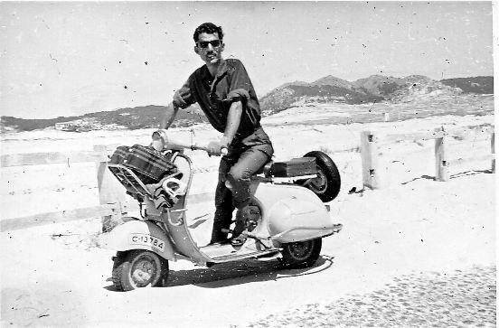 Fotografía de Amable del Río en la playa de A Lanzada, en pleno viaje de bodas que lo llevaría a recorrer la cornisa cantábrica con la vespa que le prestó su suegro. Amable nunca tuvo un vehículo propio, sus hijos lo recuerdan siempre desplazándose al trabajo en autobús.