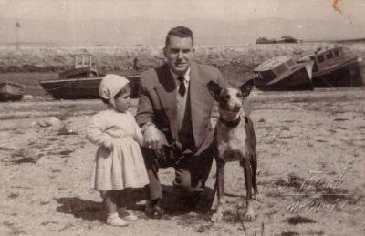 Como dice Margarita, podemos verla en esta foto con nuestro tío, Roberto Porto (+), al que acompaña su perra de caza, ‘Diana’. La historia de ‘Diana’, nuestra perra de caza, tiene un final trágico. Roberto, que entre sus múltiples aficiones figuraba la caza -que practicó en una determinada época de su vida-, tenía interés en adquirir un perro de caza, joven y de casta. Solicitó información a Barcelona, y le enviaron un catálogo con gran profusión de fotografías de los canes que tenían a la venta. Entre todos los ejemplares, que ostentaban una impresionante presencia, destacaba -esa fue nuestra apreciación- una joven y esbelta perra, castaña y blanca, cruce de galga y podenco, de nombre ‘Diana’. Llegó por ferrocarril, en una jaula acondicionada al efecto, a la otrora recién estrenada estación nueva de Villagarcía. Al atardecer del mismo día de su llegada, Roberto, impaciente e ilusionado, la llevó al Montiño para observar su comportamiento. Desenganchó la correa y la dejó en libertad. Se quedó quieta, atenta, con las orejas de punta -igual que está en esta fotografía-, y empezó a correr, perdiéndose entre la espesa y abundante maleza. Tardaba mucho en regresar, y nuestro tío, muy preocupado, temiendo que se hubiera perdido, empezó a llamarla repetidamente, adentrándose también él en aquella espesura. La perra no daba señales de vida, y ya estaba oscureciendo… ‘Diana’, con los ojos brillando en la oscuridad, apareció, al fin. Pero no venía sola, ¡traía un conejo en la boca! Durante la época de caza, ‘Diana’ demostró su buen hacer como perra cazadora, sorprendiendo a los que acompañaban a Roberto en aquellas jornadas dominicales de cacería. El patio del garaje de nuestro abuelo, padre de Roberto, era el lugar en el que ‘Diana’ tenía su alojamiento, debajo del cobertizo de la fragua. Todos los días se sacaba para que hiciera ejercicio, además de sus “cosas”, por los alrededores: antigua rampa del Cavadelo, inmediaciones del Colegio León XIII, rampa o muelle de los carabineros… Verla correr era todo un espectáculo. Su vertiginosa velocidad, así como los cambios de dirección durante la carrera, inclinándose hasta lo imposible sin llegar a “derrapar”, era todo un prodigio de equilibrio y dominio de su estilizada masa muscular. Pero, un mal día, después de hacer su habitual recorrido, se entretuvo más tiempo del acostumbrado, detrás de la caseta de los carabineros… Regresó al garaje, con paso sorprendentemente lento, vacilante, tambaleándose. Consiguió llegar al patio del garaje, y, antes de entrar en el cobertizo, se desplomó. Mi abuelo, con evidentes muestras de nerviosismo, sospechando lo que más tarde se confirmó, me envió a la droguería, indicándome que fuera a toda prisa, a buscar aceite de ricino. Cuando llegué, aquel aceite purgante ya no surtió efecto. ‘Diana’ estaba agonizando. Se había envenenado al comer un trozo de carne con estricnina, que, cada cierto tiempo, el ayuntamiento ordenaba distribuir por distintos lugares, con el fin de eliminar los perros vagabundos. Años más tarde, el lazo sustituyó al terrible veneno. Yo tendría unos doce años, y la mirada de aquella perra, dócil y cariñosa, que se iba apagando poco a poco, y que en un instante había perdido toda su vitalidad, nunca sabré si era una mirada de súplica o de despedida… Y así, con apagados gemidos de sufrimiento, dejó de existir aquella joven y esbelta perra, castaña y blanca, cruce de galga y podenco, de nombre ‘Diana’. Comentario por Roberto Núñez Porto (16-11-2010 19:32)