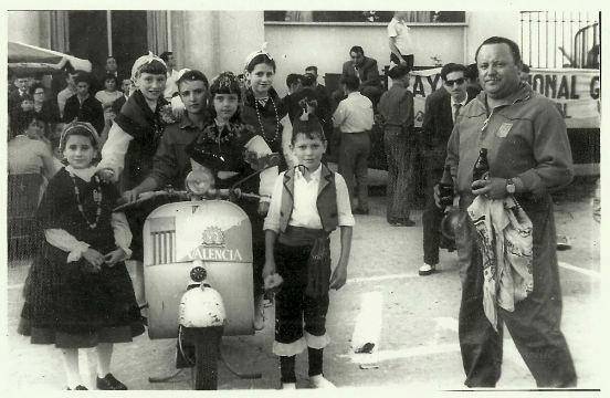 La niña vestida de gallega que posa de pie, es Rosa María (hija de Julián Mouriño), el niño Luis Alonso Quijada. Las otras dos niñas que posan vestidas con un traje regional son las hijas de Javier y Sanmartín, dos miembros del Vespa Club. La conductora por su parte es, la hija del vespista que aparece a la derecha de la fotografía con dos cervezas en la mano. El señor, venía de Valencia para participar en el I Rally Gallego, organizado por el Vespa Club Vigo en Julio de 1959. Se trataba de un evento a nivel nacional en el que participaron vespistas procedentes de todo el territorio nacional.