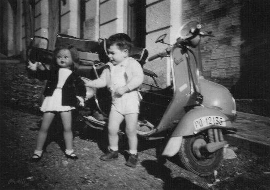 Transcurría el año 1956 cuando un jovencísimo Berto Silva fue retratado con una muñeca de su tamaño delante de la vespa con sidecar de su padre, José Silva. Cabe puntualizar que este tipo de muñecas no eran habituales en Galicia. Por aquel entonces la mayoría de niños jugaban con muñecas de cartón. Quizás por la novedad del juguete y por competir en altura con Berto, el Sr. Silva decidió inmortalizar el momento. La fotografía está tomada en la viguesa calle de A Pastora, en las inmediaciones del que era el domicilio familiar.