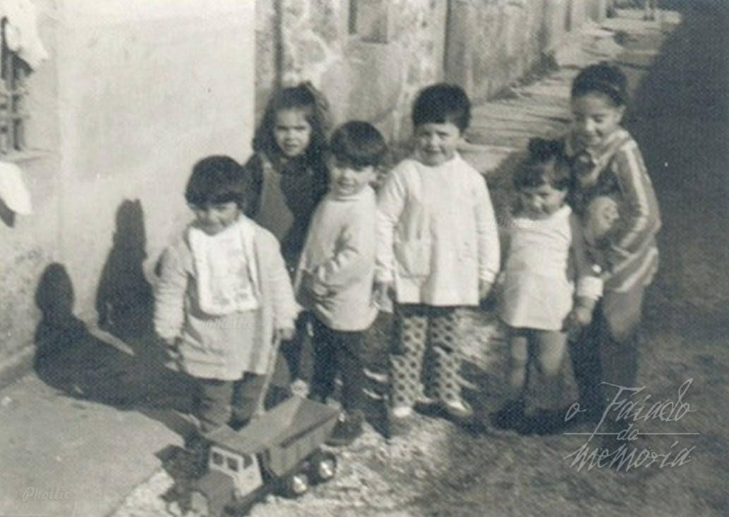 . Esto é na rúa Cervantes en Carril, aínda que todos lle chamamos A Rosa á zona dende a casa de Lourdes Varela para arriba para o norte. "O Barrio da Rosa" foi creado por aqueles que tiveron que sair de Cortegada. Esta foto debe ser polo ano 1972-73, nesta rúa sen asfaltar xogábamos a todo, case que non pasaban coches e así tíñamos un parque de xogos inmenso para disfrutar sen perigo de nada, uns coidaban os outros, todos temos entre 2 e 4 anos, non sendo a miña irman que andaría polos oito ou nove, e que aquí está coidándome.