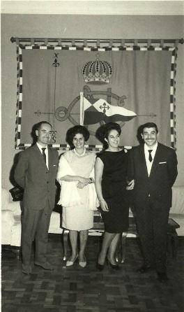 Julián Mouriño (Iizquierda) y Jose Luis Veiga (derecha) posan junto a sus esposas, bajo el escudo del Real Club Náutico de Vigo, con motivo de la Cena 5º Aniversario Vespa Club de Vigo en sus instalaciones el 11-10-1962. Según nos comenta Julián, a algunos de los socios del Náutico no les pareció demasiado bien que abriesen sus instalaciones a este tipo de eventos. Al año siguiente, con motivo del 6º aniversario, el Vespa Club celebró la cena en "Las siete Torres".