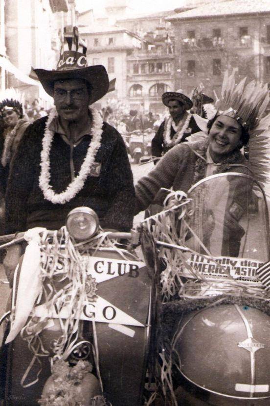 Fotografía de José Silva y María del Carmen Alonso disfrazados con guirnaldas, serpentinas y plumas en la III edición del Rally de Asturias. Teniendo como referencia la fotografía aportada por el Sr. Moreira de su participación en el I Rally día de América (octubre de 1958), y suponiendo que este Rally se celebrase anualmente, podríamos datar esta fotografía en el año 1961. Esta fotografía corresponde al momento en el que la comitiva vespista emprende el desfile multitudinario ataviados con disfraces alusivos a la "Ámérica hispana", tal y como pedían los organizadores.