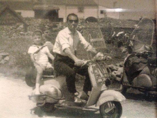 Juan José Seoane, “Cholo” para los amigos, nació en el año 1953. Sus primeros recuerdos en moto, cuando tendría entre siete y diez años de edad, lo sitúan sobre una Vespa 125N en la que su padre le llevaba a dar algún que otro paseo, así como las excursiones familiares de los domingos por los alrededores de la ciudad de A Coruña. Esta fotografía en concreto, está tomada en el año 1961.