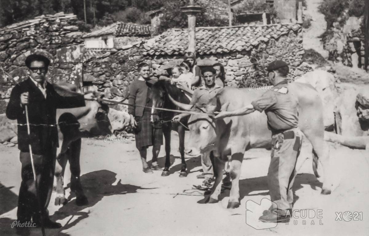 Cuando el peregrino pasaba por Oia podía contemplar la vida cotidiana de las gentes del pueblo, tal y como se puede apreciar en esta bonita imagen en la que vemos a una familia y sus vacas, la maquinaria del siglo pasado.