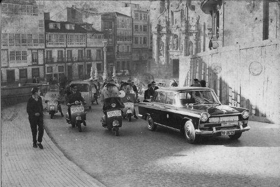 Comitiva vespista del Vespa Club La Coruña pasando por delante de la iglesia de San Jorge, en las inmediaciones de María Pita en dirección al asilo de Adelaida Muro. De estilo Barroco y con una fachada de inspiración compostelana, el templo consta de tres naves con una exuberante decoración interior.