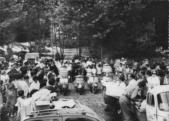 Fotografías del año 1966, tomadas en Cecebre (San Salvador), una parroquia del ayuntamiento de Cambre, en la provincia de La Coruña. La Fraga de Cecebre, es internacionalmente conocida gracias a la obra literaria de Wenceslao Fernández Flórez, "El bosque animado" por la que merodeaba el bandido Fendetestas. Estas instantáneas corresponden a la festividad de la Vespa Florida, actividad de caracter lúdico organizada por el Vespa Club La Coruña. Los participantes acudían hasta esta zona arbolada, cerca del río, con sus vespas vestidas de flores. Entre todas las participantes, un jurado deliberaba cuales eran las más vistosas y hacía entrega a sus propietarios de algunos premios y trofeos. Según hemos podido saber, se juntaban más de un centenar de personas entorno a una comida popular.