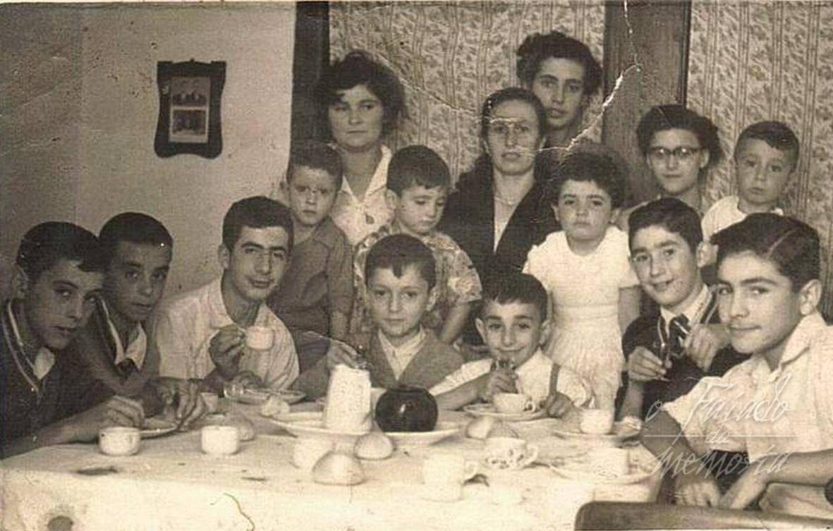 Es una merienda en casa de Lola la Sacristana. A la izquierda los hermanos Secundino y Manuel Fernández, Corujo García,la hija de los Herbeiros y su niño, el pequeño de los Montans, la hija del Sr.Francisco, que guardaba el campo de La Lomba, Lola y Pepiño, Luisa Marzal y mi primo Jesús Vázquez y el que suscribe. Eran tiempos en que eramos monaguillos. Cándido