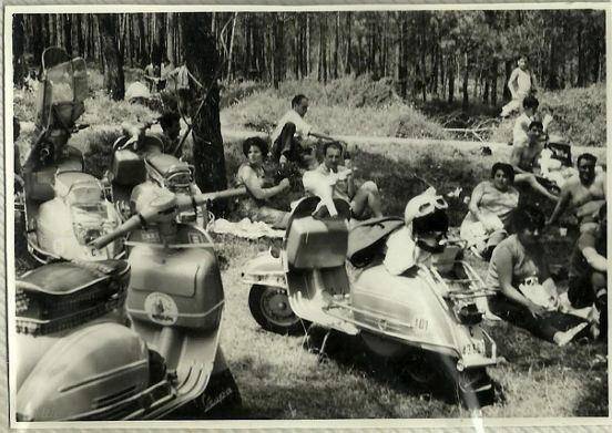 Fotografía de un nutrido grupo de vespistas pertenecientes al Vespa Club Santiago descansando en un pinar. Jorge Negreira, su secretario, contactó por carta con todos los alcaldes de Galicia para conocer las fechas de las festividades más populares en sus ayuntamientos. El objetivo era ofrecer a sus socios un variado programa de salidas. El Vespa Club de Santiago funcionó entre 1965 y 1970, con Andrés Villaverde, propietario del concesionario de la ciudad, como presidente. Por allí también andaban el mecánico Suso Pedreira, el comerciante Luis Aldariz o el hoy propietario de Motos Adán y mecánico de referencia en el mundillo, Manolo Pérez Adán.
