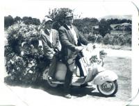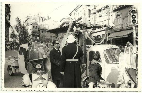 Momento en el que la Comitiva vespista del Vespa Club Vigo y su Presidente Julián Mouriño, hacen entrega del aguinaldo al guardia delante de General Óptica, en plena puerta del Sol. En la fotografía se puede apreciar como en uno de los vespacarros llevan un abeto adornado y en el otro un paje Real ofrece una copa de cava al guardia.
