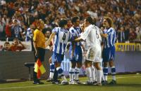 Afeccionados do Dépor mostran unha pancarta durante a final da Copa do Rei de 2002, disputada entre o Real Madrid e o Deportivo no estadio Santiago Bernabéu o 6 de marzo de 2002. O Dépor impúxose por 1-2 ao equipo branco, que celebraba ese día os cen anos da súa fundación.