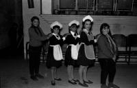 Cando chegaba o Santo Tomas de Aquino na primeira semana de Marzo, habia nas escolas un dia de vacacions, e actos a esgalla, este era do Leon XIII, vemos a Jesus Garrido, Director do colexio, a sua beira Francisco Chantada o cura da vila e a o microfono Amadeo Abalo que compaxinaba en aqueles tempos o seu traballo no Banco Hispano e a sua aficion pola Radio, neste caso botaba unha man na Radio, emisora parroquial