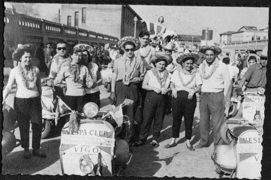 Fotografía de 1958 de varios integrantes del Vespa Club Vigo en el desfile del Rally de Oviedo "I Rally de América". En ella aparecen de izquierda a derecha, según recuerda Carlos Moreira: la mujer de Álvaro Fernandez (autor de la fotografía y de profesión practicante) Paino con gafas oscuras y Carmen del Río con su característica trenza. A la derecha de todo, posan Ribeiro y su esposa. Carlos Moreira aparece en segundo plano con su inconfundible bigote.