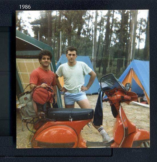 Iñaki Osorio es un reportero fotográfico orensano, cuya trayectora profesional siempre ha estado ligada a una vespa. Aquí lo vemos en 1986 posando (con camiseta blanca) en una jornada de camping. Uno de esos recuerdos ochenteros que añora, son las paradas técnicas que hacía en sus deplazamientos a la Rías Bajas para tomarse un bocadillo de jamón. Dependiendo de la ruta elegida, el avituallamiento se hacía en A Cañiza o en Soutelo de Montes. Hoy en día con la autovía, poca es la gente que se desvía.