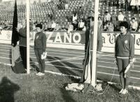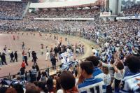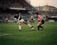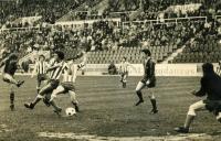 Joanet atrapa el esférico ante Gabriel Lezcano, en un lance del encuentro de la 28ª jornada del Campeonato de Primera División de la Temporada 1969-1970, disputado el 5 de abril de 1970 en el Estadio de Riazor. El Celta venció al Deportivo por 0-1. El recinto presentaba una pequeña grada provisional en el fondo del Pabellón de los Deportes.