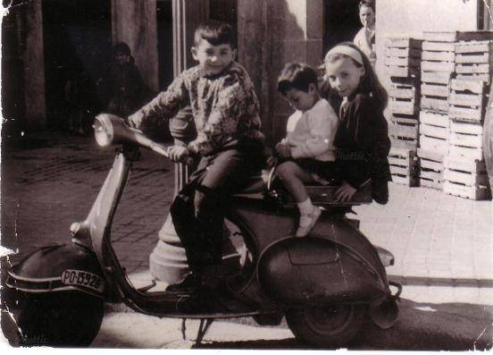 Fotografía de Juan Zaragoza con sus dos hermanas. Pili con una cinta blanca en la cabeza, y la más pequeña de nombre Maló. Los tres están sentados en la vespa de su padre y posan en la Alameda de Bouzas en Vigo. Delante de la casa de su abuela. La fotografía es de 1961 ó 1962 aproximadamente. Juan nos comenta que era habitual verlo conducir la vespa con su padre sentado detrás. Hoy en día, lo que lleva a sus espaldas son... varias Eurovespas.