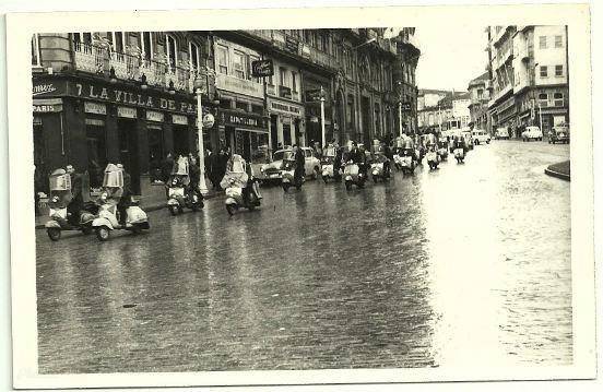 Desfile del Vespa Club Vigo por la céntrica Puerta del Sol viguesa el 20-12-1965, con motivo de la entrega del aguinaldo a los guardias. Como se puede apreciar, la buena parte de los vehículos iban equipados con cortavientos y loneta para hacer frente a la lluvia.