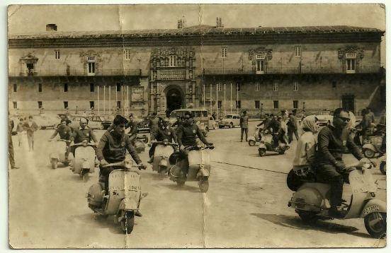 Fotografía de mediados de los años 60 correspondiente al momento en el que la comitiva del Vespa Club Pontevedra abandona la Plaza del Obradoiro con motivo de una reunión de clubes gallegos.