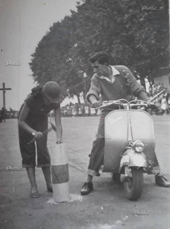 Con motivo de las fiestas de la Virgen de la Peregrina, a finales de los años 50, se celebraban en la alameda de la ciudad gymkanas y pruebas de habilidad para el deleite del público en general. Hasta las orillas del Lérez se acercaban en sus vespas casi todos los vespa clubes de la comunidad gallega para no solo participar en estas pruebas organizadas por el Vespa Club Pontevedra, sino también para hacer una comida de gala y para bailar hasta altas horas de la madrugada. En esta foto en concreto, que recopilamos de la página de Facebook de VESPA FARO BAJO, podemos apreciar un par de detalles curiosos. En aras de organizar un evento al que acudían habitualmente los matrimonios, los vespistas llevaban a una acompañante femenina para completar el reto. En esta estación había que clavar una punta con un martillo en un poste. Como se parecía, la señora lleva un casco de los denominados masculino. Fácilmente reconocible por la visera. Los de las señoras al ir habitualmente "de paquete" carecían de este complemento para evitar el sol y la lluvia. Tecnología punta de los años 50.