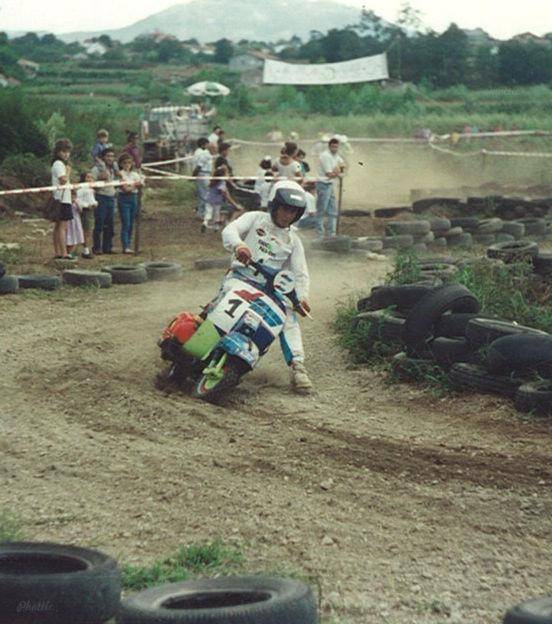 Si los años 60 se caracterizaban por sus salidas grupales, los rallyes y los picnics en carballeiras, en los 80 las juventudes vespistas rectificaban motores, competían en asfalto, tierra o arena y no dejaban un solo hueco de sus monturas sin pegatinas. Hablando con Tino, en su día propietario de TROCO CAFETO en Vigo, comentaba que Jose (habitual de estas carreras) le fue un día por el local buscando su patrocinio. Las tarifas para una sola pegatina iban desde las 3.000 pesetas para una pequeña hasta las 5.000 para una de dimensiones mayores. En esta fotografía en concreto, de Octubre de 1.99, aparece "Pisco" (también conocido como "El Buzo") tomando una curva de izquierdas en la Carrera de Vespaterra del Circuito de Goián. Esta instantánea es cortesía de Benito Araujo.