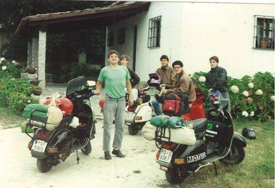 Fotografía cortesía de Benito Araujo, tomada en Mollabao, en la que un grupo de jóvenes pontevedreses (entre los que está el mimo Koki), cargan los petates para participar en la concentración de motos de Sanxenxo. Era el mes de Septiembre del año 1.979. Entre los participantes en aquella excursión se encontraban Matías, Perico, Puncho, Oscar, Puime, Koki y Pablo, entre otros.