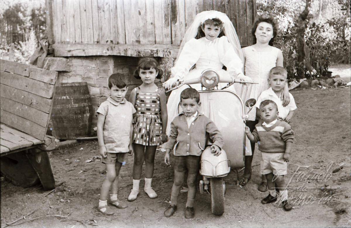 A nena fixo a sua primeira comunion, de esas fotos, miles, que non sabemos a identificacion das persoas, na festa a nena sigue vestida cas suas galas de un dia especial, cos amigos e subida a unha vespa, posiblemente propiedade do retratista.
