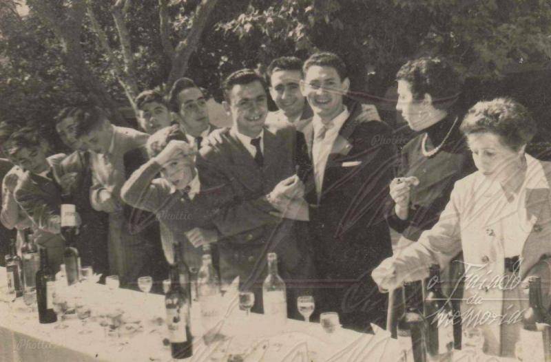 Debe ser una fiesta del textil. La primera por la derecha se parece a Manolita la mujer de Marcelino Diaz, despues Pili Bobo y a continuación Luis Brun, Lito, Chua, Julian Lumeras y José Dorgambide y el último me parece Martín Brianes que tambien era del gremio. Cándido