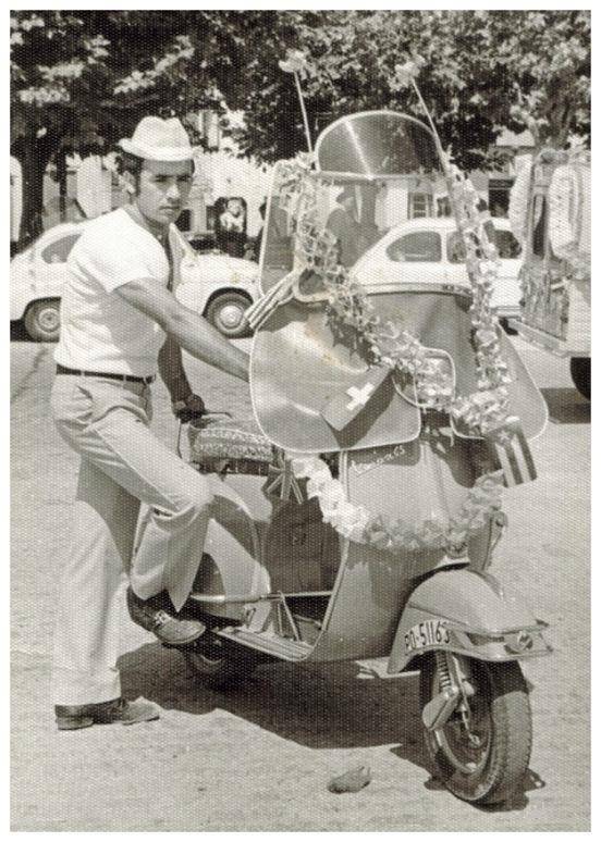 En 1970, José Miranda Otero compró su Vespa 150 GS a un vecino de Nerga en Hío. Quien a su vez la había adquirido tres años atrás. El precio no lo recuerda demasiado bien. Por su cabeza ronda la cifra de siete u ocho mil pesetas. Fue el primer vehículo familiar hasta que años más tarde fue reemplazado por un Mini que el padre de David Miranda (conocido en el mundillo vespista como"XX") alquilaba cada vez que llegaba de estar embarcado. La foto está tomada en 1974. En la alameda de Cangas (ahora la llaman Alameda Vieja) en la Fiesta en honor a San Cristóbal. Por aquel entonces los vecinos adornaban los vehículos con guirnaldas, banderas y flores, para después todos juntos recorrer la península del Morrazo en caravana. Con el tiempo, la vespa fue quedando en desuso. Aparcada en el fondo del garaje. Acumulando polvo. Hasta que un buen día, allá por el 2005, David decidió despertarla de su letargo. David con tan sólo 12 años ya la cogía para desplazarse a la playa, subir al monte o hacer recados por el pueblo adelante.