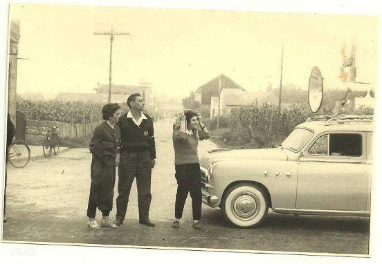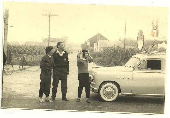 En esta fotografía aparecen Manuel Alonso Estévez y su cuñada, junto con María Estrella, la esposa de Julián Mouriño. Se trata del día previo a la Festividad de Santiago de Compostela y corresponde al I Rally Gallego. Como miembros de la organización, disponían de un vehículo dotado de altavoces para asistir al grueso del pelotón. En el reverso se puede leer: "Rallye Nacional Vespa Club de Vigo. A Santiago. 24-7-1959"