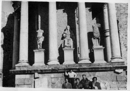 Debido a que estas fotografías nos llegaron en un Cd sin apenas más información que pertenecían al album familiar de Álvaro Fernández (farmacéutico-practicante) y que interpretamos que se correspondían a tan solo dos viajes realizados por este matrimonio fuera de Galicia, el Rally Día de las Américas en Asturias y el Vespa Rally Camping de Sevilla de 1958, entendemos que estas fotografías pertenecen al segundo de los rallies a su paso por la localidad extremeña de Mérida. En la instantánea inferior posa el matrimonio Fernández con el acueducto como telón de fondo. Arriba, sin demasiada certeza, intuimos distinguir a Montse (esposa de Javier) junto a Paino y a su esposa Loli.