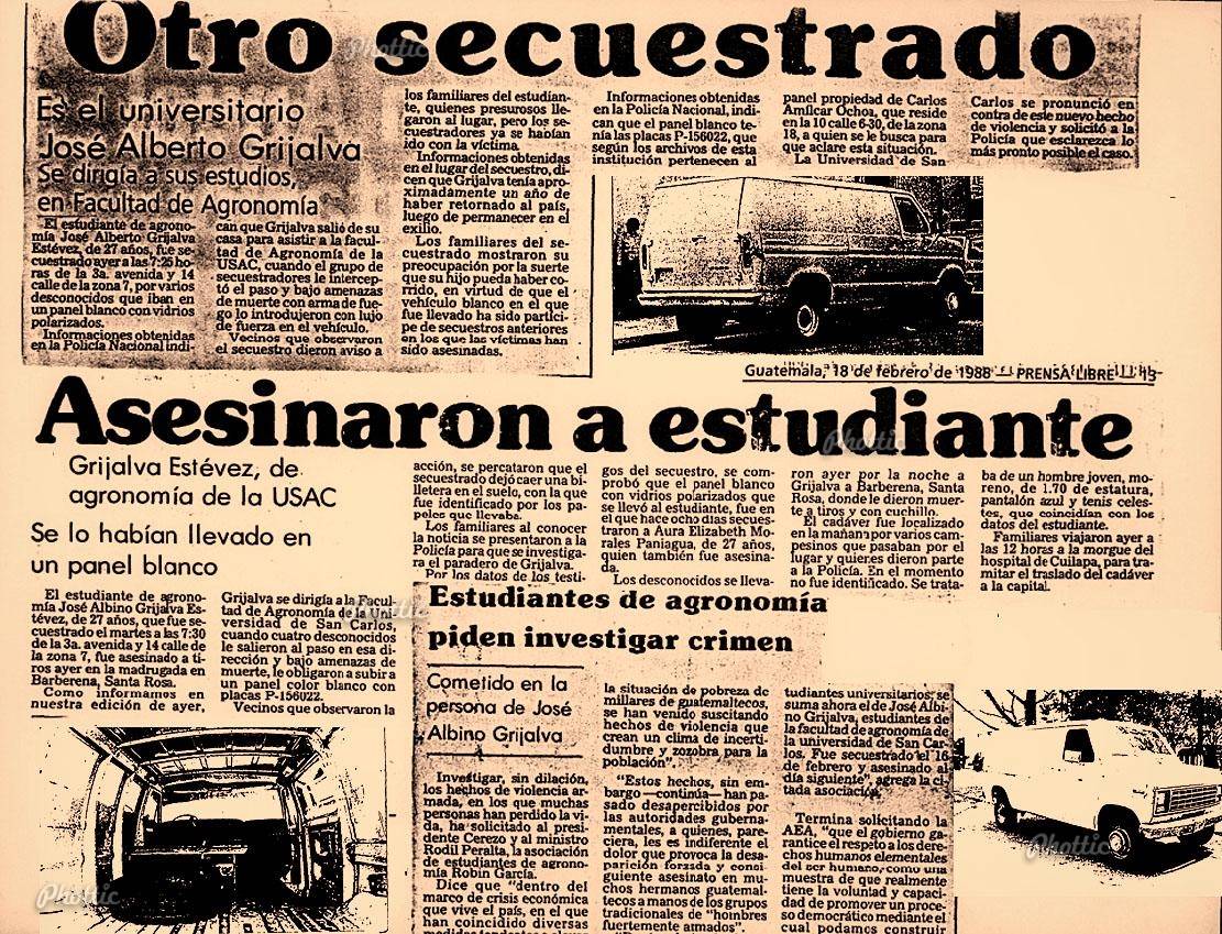 En el mes de febrero de 1988, individuos armados que se conducían en una panel color blanco con placas P156022 capturaron con violencia al estudiante José Albino Grijalva Estevez. El hecho ocurrió en la 30 avenida entre 14 y 15 calle de la zona 7 capitalina, cuando la víctima junto a su novia se dirigían a la parada de buses para ir a la universidad. Al día siguiente apareció su cadáver con señales de tortura en el kilómetro 59 de la carretera interamericana, aldea San Mateo del municipio de Cuilapa, en la entrada de la Finca Morelia. José Albino, originario de La Mocha, Pasaco, Jutiapa, estudiaba en la facultad de Agronomía de la Universidad de San Carlos. Había estado exiliado 5 años, regresó en 1986 confiado en las garantías ofrecidas por el gobierno civil de Vinicio Cerezo. Fue una de las víctimas de la llamada “Panel Blanca”, una estructura conformada por miembros de la Guardia de Hacienda a las órdenes del Estado Mayor Presidencial, que utilizó ese tipo de vehículos para secuestrar y posteriormente asesinar a varias personas. (Imágenes Prensa Libre).