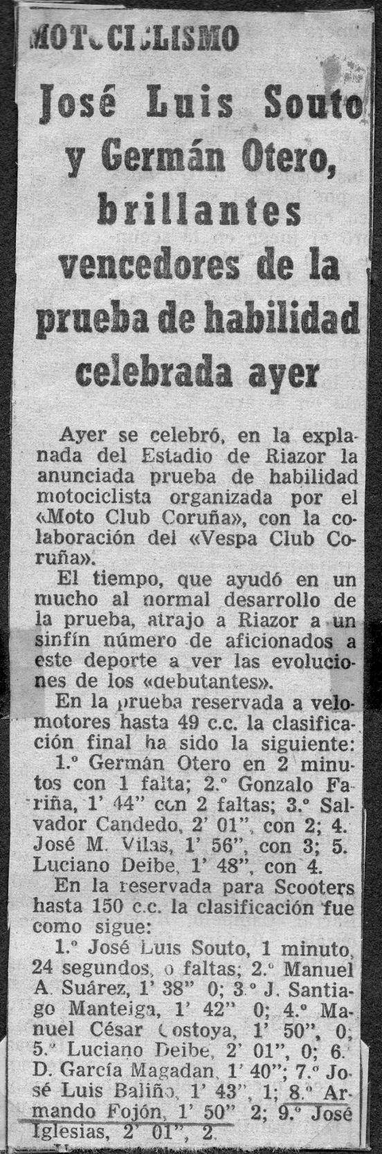 Artículo de prensa, cortesía de Armando Fojón, correspondiente a una gimcana celebrada en la explanada del Estadio de Riazor por el Vespa Club de La Coruña en la década de los 60.
