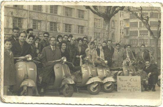 Fotografía tomada en la Plaza de Galicia de A Coruña, correspondiente a la "Prueba del pavo" organizada por el Vespa Club La Coruña. Pepe Castilla es el primero empezando por la izquierda (en segunda fila). Justo debajo del árbol, con abrigo negro y bigote, se encontraba José María Arrojo "muy buena gente -apunta Pepe- tanto él como su hermano Carlitos". Por su parte y posando en la segunda vespa empezando por la izquierda (matrícula C-13580) nos encontramos con César, la segunda generación de los conocidos establecimientos "Bonilla a la vista, churros y patatas fritas". La prueba consistía en esconder un Pavo en uno de los portales de la Plaza. Los participantes, subidos a sus vespas, debían de encontrarlo mientras circulaban por sus alrededores. "No me acuerdo quien ganó. Yo no me llevé nada".