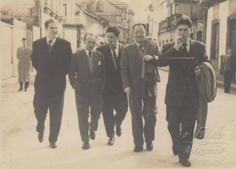 E como non habia moitos coches polo mesma estrada, son cinco amigos, desde a esquerda Juan Maria, Pepe Redondo, Jose Gonzalez Cores, finado esta seman, ,Castellanos e Calixto Abalo pasan por diante da tienda de Oubiña, o cheiro a cafe, moscatel e cacahuetes, ainda hoxe o paladeamos, o sentimos, tamen as parrandas que organizaba Manso ca sua acordeon e os seus amigos.