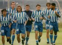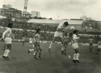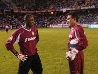 Ronaldinho cabecea ante la mirada de Arbeloa, en el partido de la 9ª jornada del Campeonato de Primera División de la Temporada 2006-2007, disputado entre Deportivo y Barcelona en el Estadio de Riazor, el 4 de noviembre de 2006. El partido finalizó con empate 1-1.