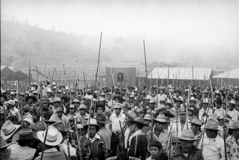 “Después de la toma de San Miguel Acatán, la imagen del Che apareció en las mantas y banderas que el Ejército Guerrillero de los Pobres colgaba en las aldeas y los caminos. La estrategia de la guerrilla ya no era pasar desapercibida sino anunciarse como una opción frente al gobierno. A finales de 1980 el EGP dio un salto y extendió su presencia al sur de Huehuetenango, al área mam. En varias partes la guerrilla pasó de ser rumor a presencia real". (Kobrak, Huehuetenango historia de una guerra). Fotografía en archivo de CIRMA, reunión de guerrilleros del EGP y población civil.