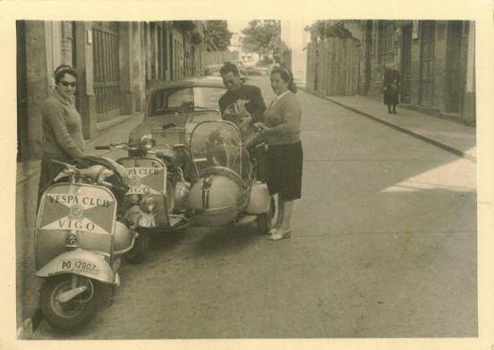 Una nueva instantánea tomada por Manuel Trigo en la ciudad de Ferrol, con Manolita y los Sres. San Martín al lado de su sidecar, el cual como se aprecia, viene equipado con un curioso cortavientos.