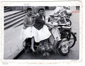 Fotografía de Conde, perteneciente al archivo personal de Tito Sabucedo, datada en 1958 y catalogada por Rafael Salgado en Ourense no tempo. Esto es lo que nos comenta Rafael en su blog: "Desconozco el motivo, pero esta acera de los jardines del padre Feijoo, habitualmente en las fotografías de mi archivo, aparece abarrotada de motocicletas, lo normal es que fueran las típicas Vespa o Lambretta de los profesionales de la fotografía, pero si nos fijamos vemos que cualquier vehículo de dos ruedas encontraba sitio donde aparcar. Bueno en la imagen de hoy se nos ha colado un intruso, si observáis la flecha roja que os he colocado, descubriréis que en Ourense también circularon los Biscuter".