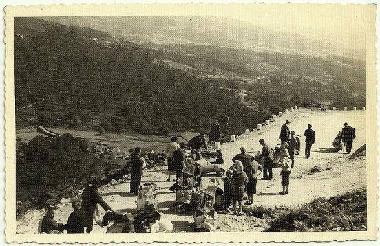 Tras pasar unos minutos contemplando las vistas panorámicas que ofrece el mirador de la Peneda, el grupo de excursionistas pertenecientes al Vespa Club Vigo que se habían unido a esta salida dominical, se disponen a emprender el camino de vuelta a casa. En el reverso se puede leer: "Sotomayor. Preparándose para el descenso del monte de la peneda. Nuestra primera excursión del Vespa club de Vigo. 3 de mayo de 1959". Esta fotografía ha sido donada por Julián Mouriño, Presidente del Vespa Club Vigo de 1961 a 1965.