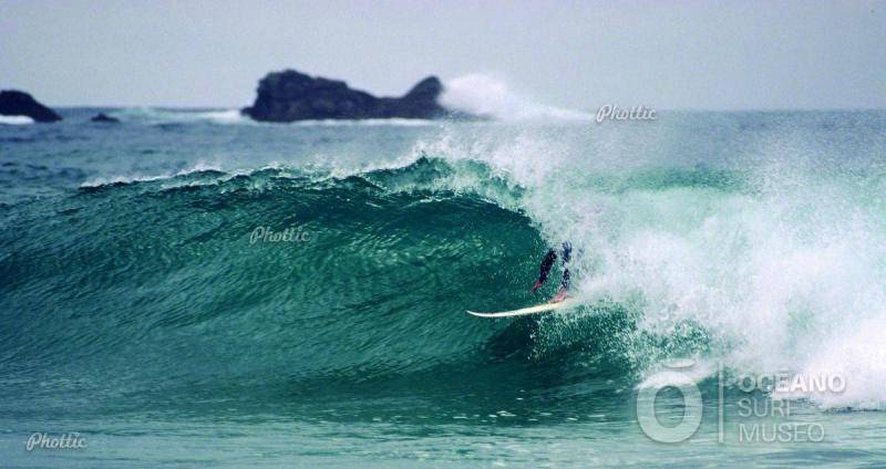 Espectacular fotografía de Gonzalo Cueto tomada durante la única participación del hawaiano Marty Thomas en el Pantín Classic de 1995, en el que obtuvo la quinta plaza. Al fondo, los islotes de Marnela.
