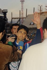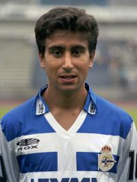 Diego Tristán conduce a pelota nun lance da final da Copa do Rei de 2002, disputada entre o Real Madrid e o Deportivo no estadio Santiago Bernabéu o 6 de marzo de 2002. O Dépor impúxose por 1-2 ao equipo branco, que celebraba ese día os cen anos da súa fundación.