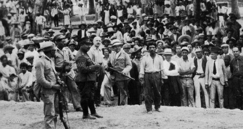 En enero de 1932 campesinos indígenas de origen pipil, cansados de los abusos de terratenientes, militares y políticos, se levantaron en El Salvador. La insurrección inició el día 22 instigada por el Partido Comunista Salvadoreño. En el municipio de Jayúa, departamento de Sonsonate, los alzados al mando del líder indígena Francisco “Chico” Sánchez tomaron el control de la alcaldía. Sánchez ordenó que le entregaran todos los títulos de propiedad del municipio para redistribuir las tierras. El 28 de enero tropas gubernamentales con el apoyo de milicias civiles, retomaron el municipio e iniciaron una cacería de indígenas que provocó el casi exterminio de la población pipil. Fotografía, Francisco Sánchez antes de ser fusilado en la plaza de Juayúa, 28 enero 1932.