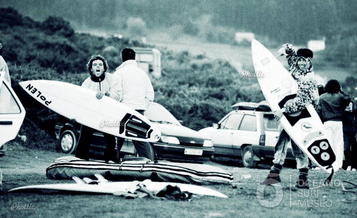Un grupo de surfistas procedentes de Portugal "desembarca" en Pantín para participar en la segunda edición del campeoato. En la foto, preparando sus tablas.