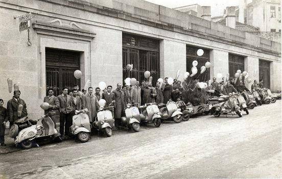 Si hablamos de los pioneros del vespismo vigués, esta fotografía correspondiente a la entrega del aguinaldo a los guardias delante de las instalaciones de Kaifer, así lo atestigua. Más de una docena de vespas de faro bajo (algunas de ellas con remolque acoplado) posan entre globos a finales de los 50. Tomando como referencia la cuarta vespa empezando por la izquierda, aparece con su frondoso bigote Salvador Jané, padre de Jorge Jané Comesaña donante de esta instantánea. A diferencia de otras fotografías tomadas en la calle Pontevedra con motivo del aguinaldo navideño, en esta se puede apreciar por los manillares de las vespas, la antiguedad de los modelos.