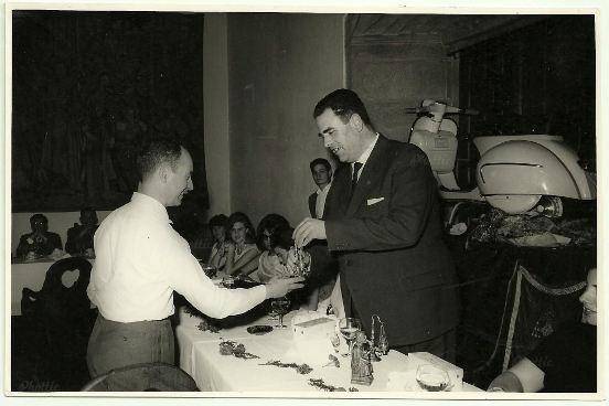 En el reverso puede leerse: "Dia de la Vespa. 28 de junio de 1964. El Alcalde entrega un recuerdo de Santiago al Presidente del Club Vespa de Vigo". También los sellos del Estudio de fotografía "Fotos Cine Almeida, Bautizados-11 Santiago" y el de "Hijos C. V. Otero. Servicio Vespa. General Franco, 22. Santiago".