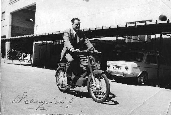Jose María Arrojo, distribuidor Vespa en A Coruña, circulando con un vespino en las instalaciones de Perillo.