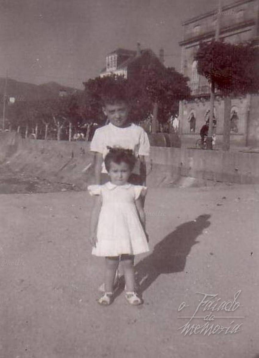 Na fotografia dous miniños da familia Mosquera, atras a Alameda, o mar chegaba a carretera con pavimento de adoquin, a dia de hoxe afortunadamente sigue en pe o edificio construido polo emigrante Juan Garcia que vemos a dereita