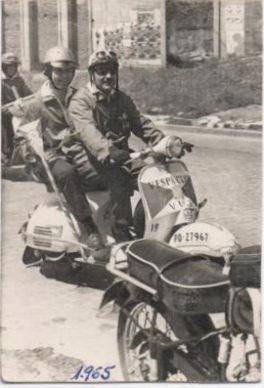 Fotografía en ruta de Antonio Monje y otro compañero del Vespa Club Vigo (con un bastón de peregrino) camino de Santiago de Compostela con motivo del Rally celebrado en la capital gallega. Junio de 1965. Año Santo Compostelano.